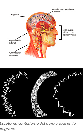 La migraña es la segunda causa de cefalea. Generalmente se asocia a síntomas precisos dentro de los cuales los visuales adquieren gran importancia. Estos se manifiestan en forma de escotomas parciales (áreas de no visión), visión de chispas o rayos de luz, fotofobia